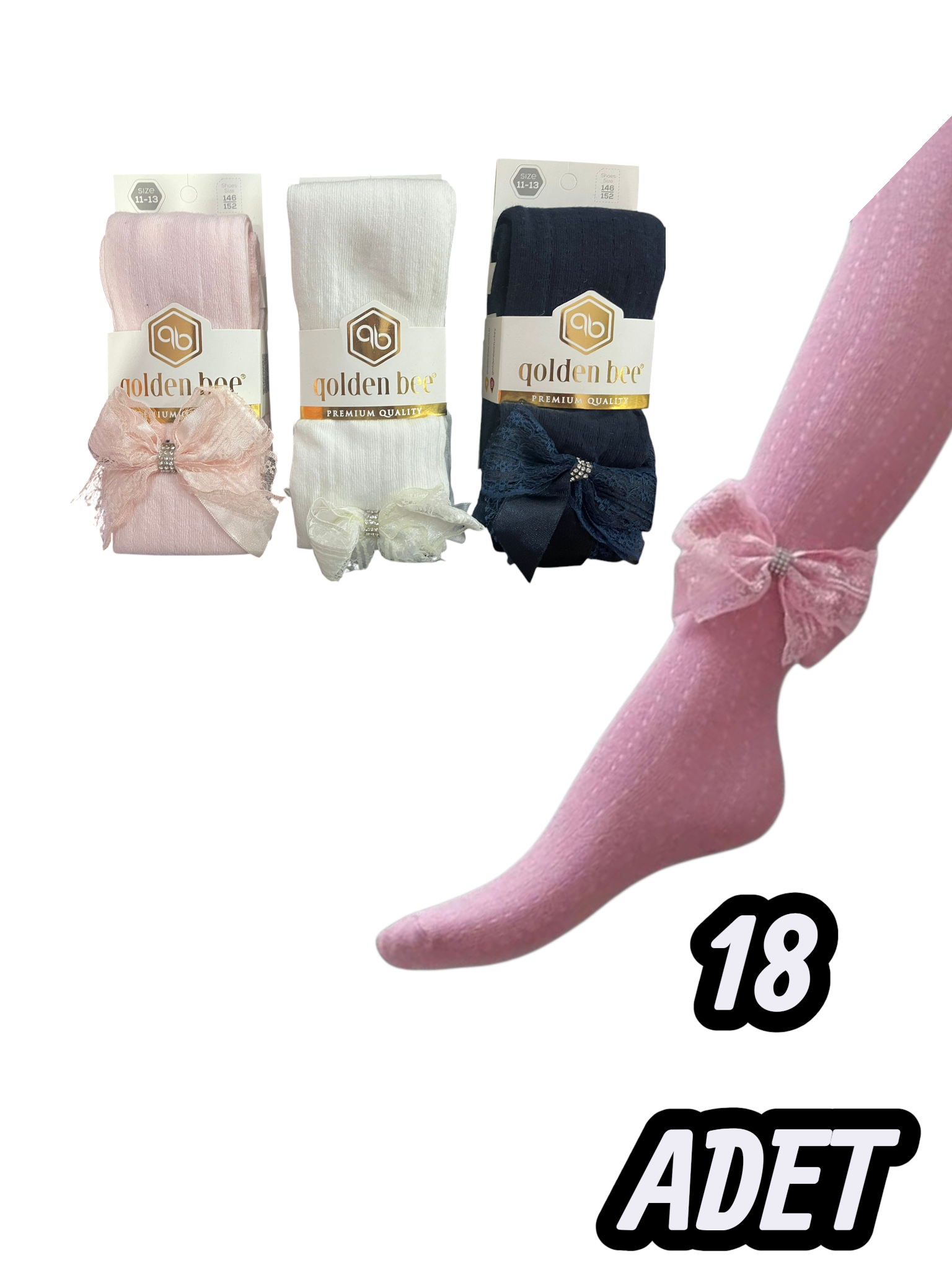 Çöğen Toptan olarak, Golden Bee markasının kalitesini, aksesuarlı şıklıkla birleştiren Çocuk Kilotlu Çoraplarını 18'li ekonomik toptan paket avantajıyla sunuyoruz. Her bir çifti özenle seçilmiş fiyonk, dantel gibi detaylarla süslenmiş bu çoraplar, çocukların günlük kombinlerine eğlenceli ve zarif bir dokunuş katar.