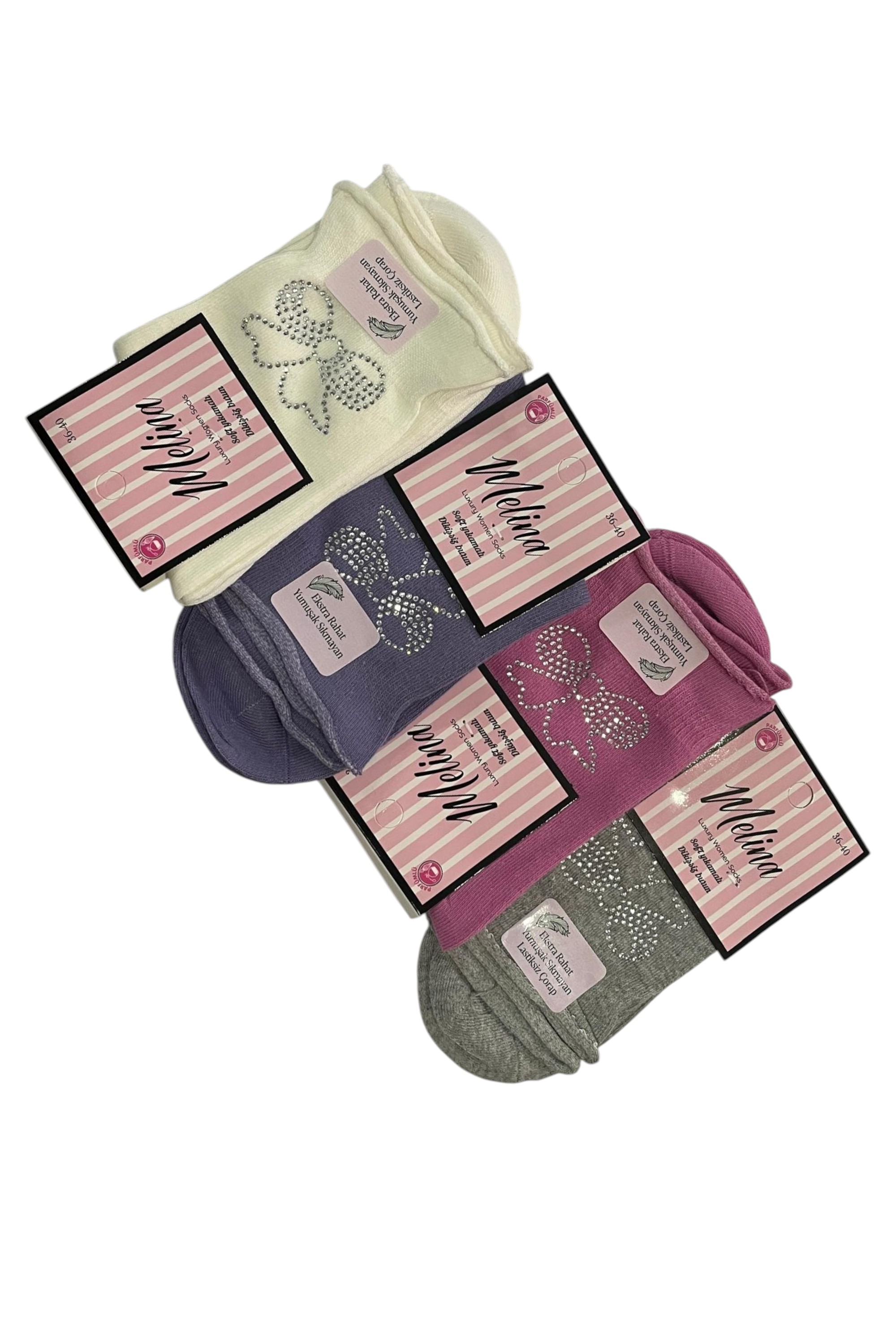 Detaylarla gelen şıklık: Melina Aksesuarlı Kadın Çorap. Bu özel seri, şık ve zarif aksesuarlarla zenginleştirilmiş tasarımıyla sıradan çorapların ötesine geçer. Üzerindeki küçük fiyonklar, dantel işlemeler veya parlak detaylar sayesinde, her adımda göz alıcı bir stil yaratır.